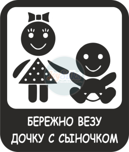 Виниловая наклейка «Бережно везу дочку с сыночком» изготовлена из высококачественного материала желаемого цвета, вырезанная по контуру. Минимальный размер наклейки: 7x8 см. Наклейку можно сделать любым представленным цветом. Клеющий слой из полиакрилового клея. Легко удаляется с поверхности. Любая печатная наклейка в каталоге может быть исполнена в контурном варианте без фона, и наоборот, любую контурную наклейку можно изготовить полноцветной.
