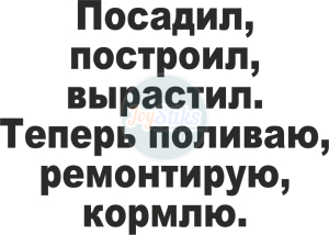 Виниловая наклейка «Посадил, построил, вырастил...» изготовлена из высококачественного материала желаемого цвета, вырезанная по контуру. Минимальный размер наклейки: 10x6 см. Наклейку можно сделать любым представленным цветом. Клеющий слой из полиакрилового клея. Легко удаляется с поверхности. Любая печатная наклейка в каталоге может быть исполнена в контурном варианте без фона, и наоборот, любую контурную наклейку можно изготовить полноцветной.