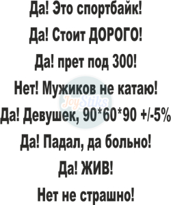 Виниловая наклейка «Да, это спортбайк1» изготовлена из высококачественного материала желаемого цвета, вырезанная по контуру. Минимальный размер наклейки: 16x19 см. Наклейку можно сделать любым представленным цветом. Клеющий слой из полиакрилового клея. Легко удаляется с поверхности. Любая печатная наклейка в каталоге может быть исполнена в контурном варианте без фона, и наоборот, любую контурную наклейку можно изготовить полноцветной.